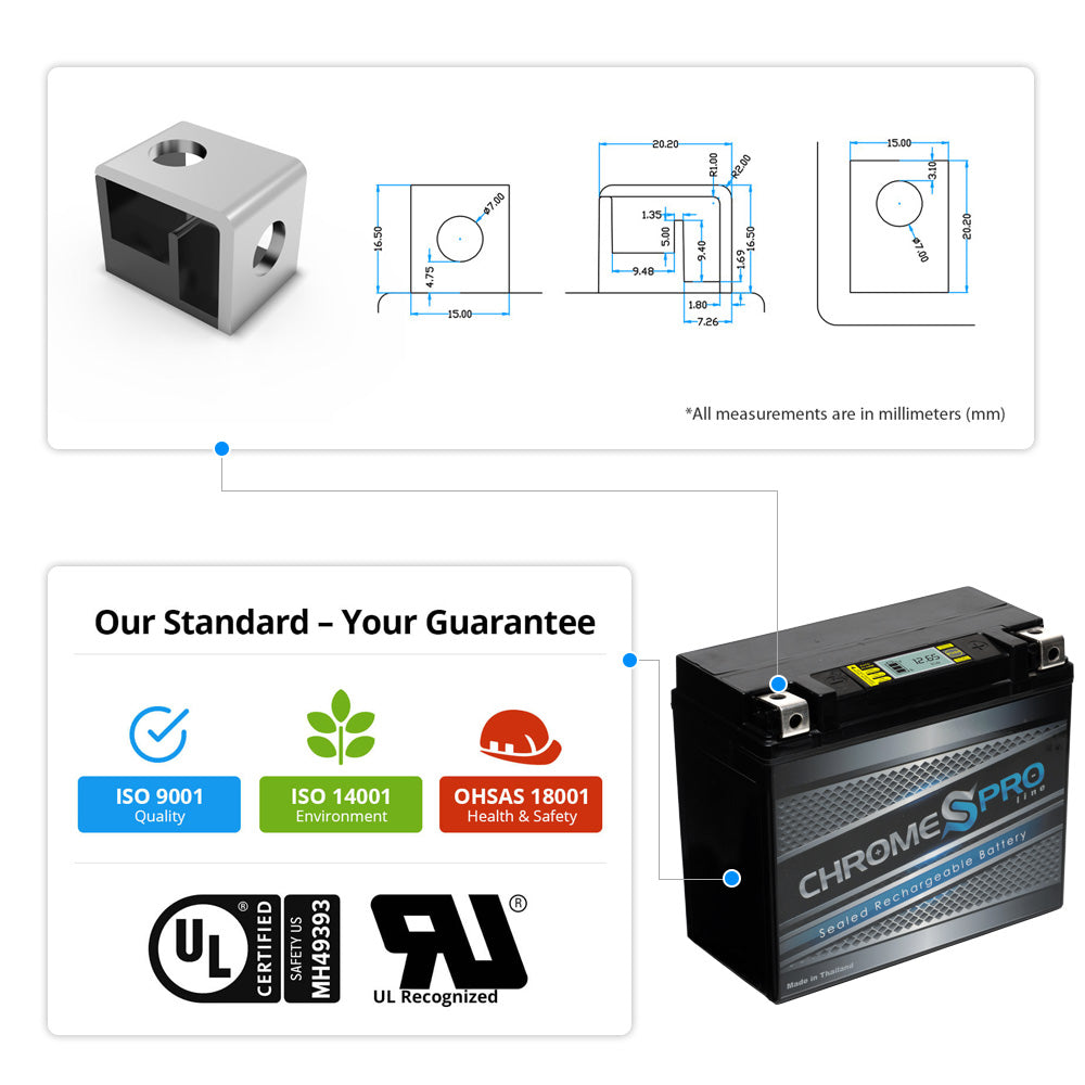 Chrome Pro introduces the YTX20HL-BS iGel battery series, designed for customers who seek rigorous standards and quality. Featuring a built-in battery display to accurately read voltage and injected with Gel electrolytes, these batteries redefine excellence. The Gel electrolytes give the battery a low electrode wear, and thus a longer life. The display reads the voltage of the battery and alternator while an alarm warns you if there is low capacity/voltage or abnormalities. Elements like the tough bridge welding, which helps to absorb vibrations, make this battery the premier choice of Power Sport adventurers. Chrome Pro iGel series boasts a 24 Month Warranty, 60 day guaranteed refund, 2 Day shipping, and extended life expectancy than our other brands: Zipp, Pirate, and Chrome.